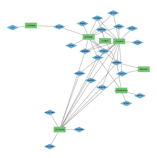 도출된 결과를 Cytoscape에 입력하여 성분–타깃–경로 네트워크를 시각화합니다.