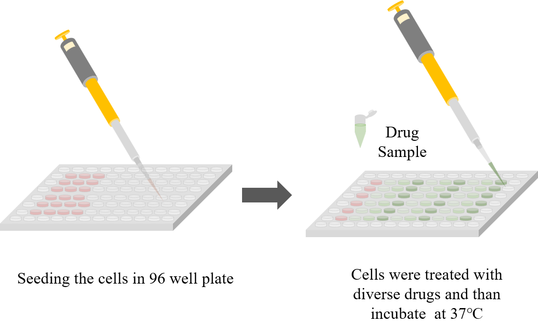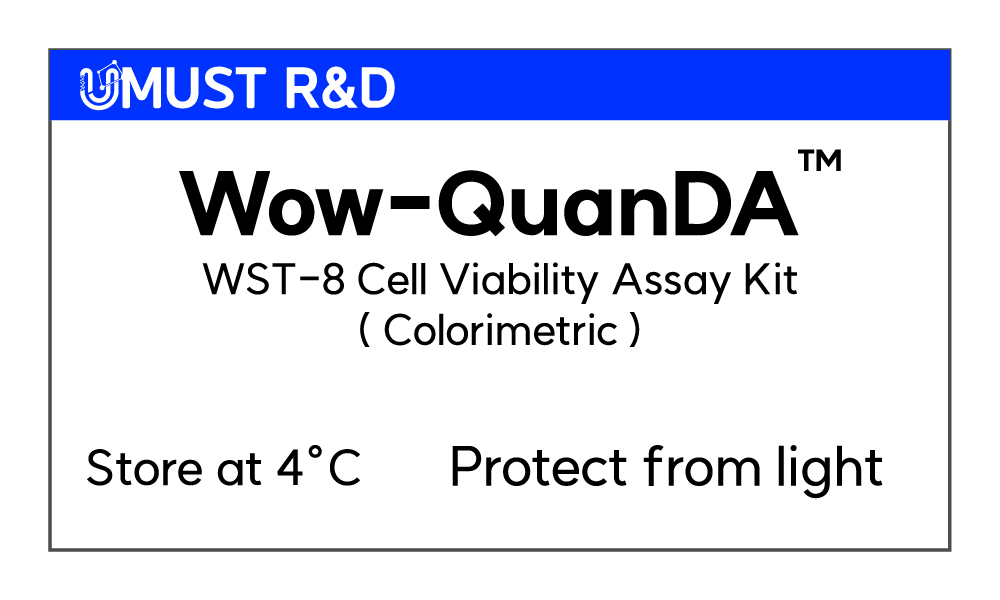 유머스트알엔디의 Wow-quanDA™ Cell Viability Assay Kit 은Colorimetric assay 방식으로 세포 증식/독성을 측정할 수 있는 편리하고 민감한 감도를 가지는 제품입니다. 세포내의 Dehydrogenase의 활성에 의해 발생되는 전자를 Electron mediator가 세포막을 자유롭게 이동하면서 배양액 내의 WST-8을 환원시켜 오렌지색의 Formazan을 생성합니다. 물에 녹지 않아 유기용매 (DMSO)가 필요한 MTT assay와는 다르게 물에 잘 녹는 WST-8을 사용함으로써 사용이 편리해지고 세포에 영향을 주는 반응 변수들을 제거한 제품이고 또한 안정적이며 보다 높은 민감성을 갖는 제품입니다.