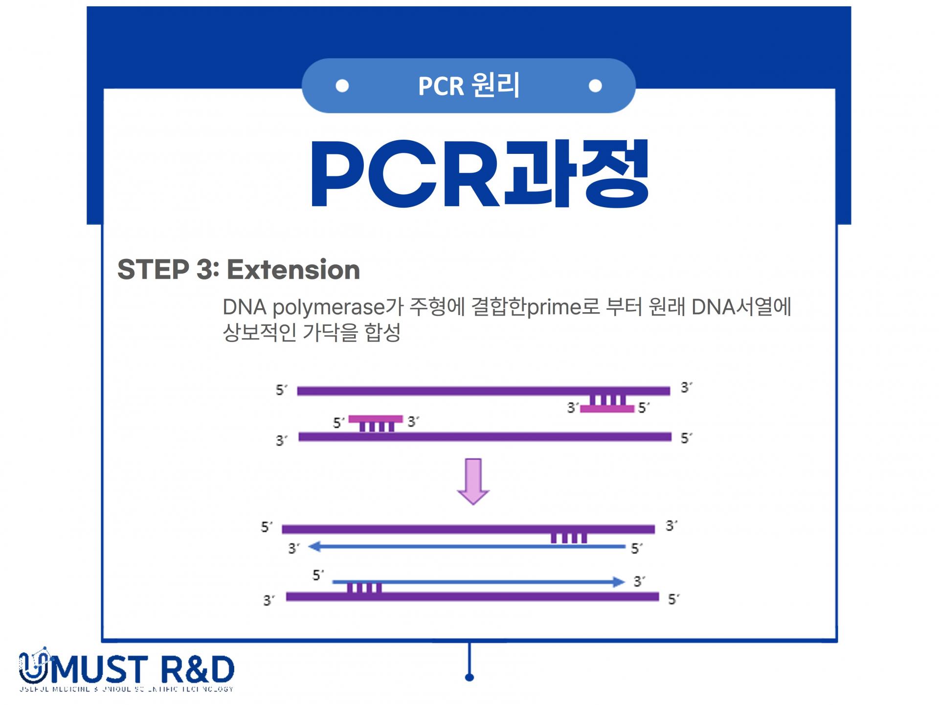 3) 신장: DNA 중합효소가 새로운 DNA 가닥을 합성